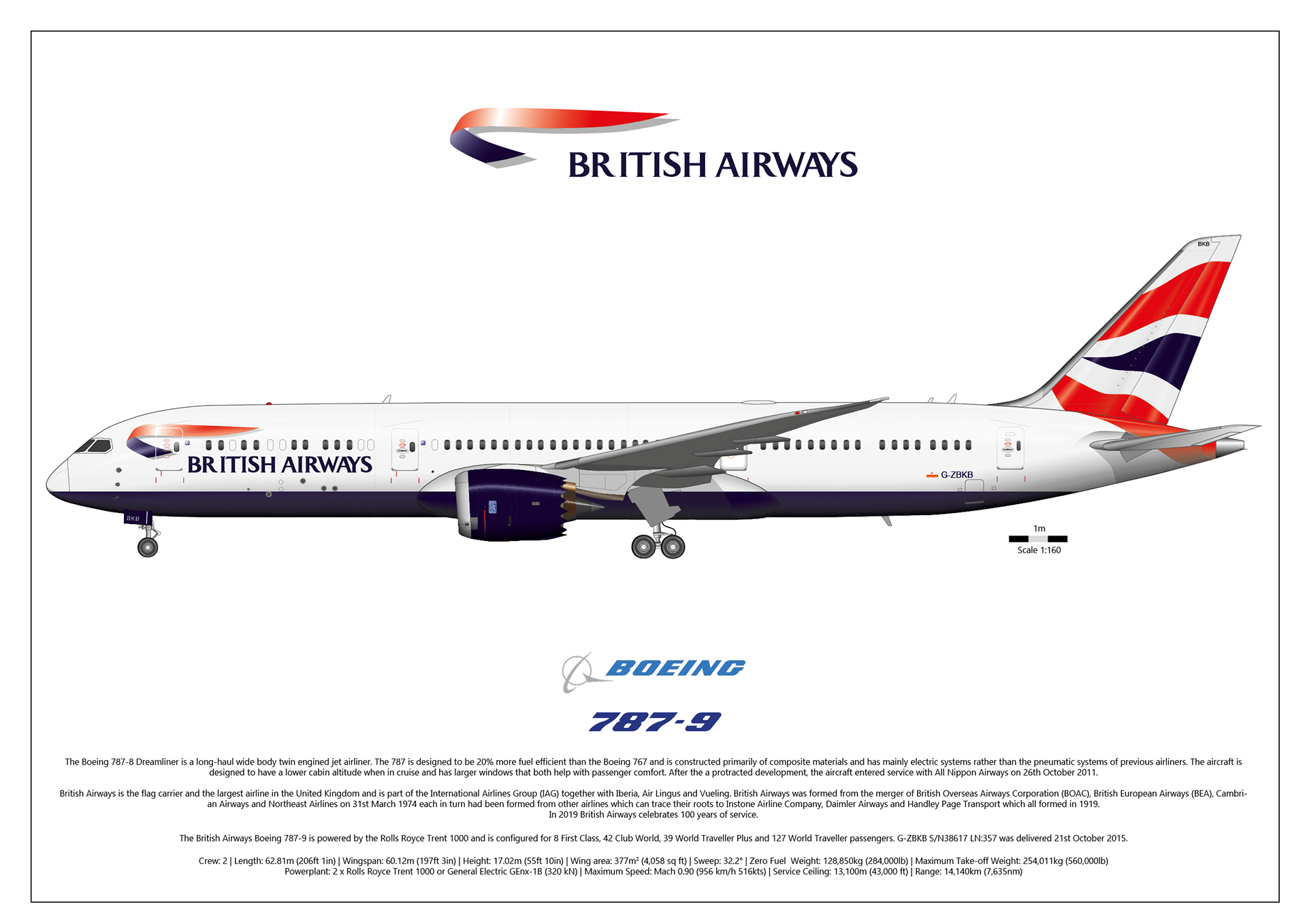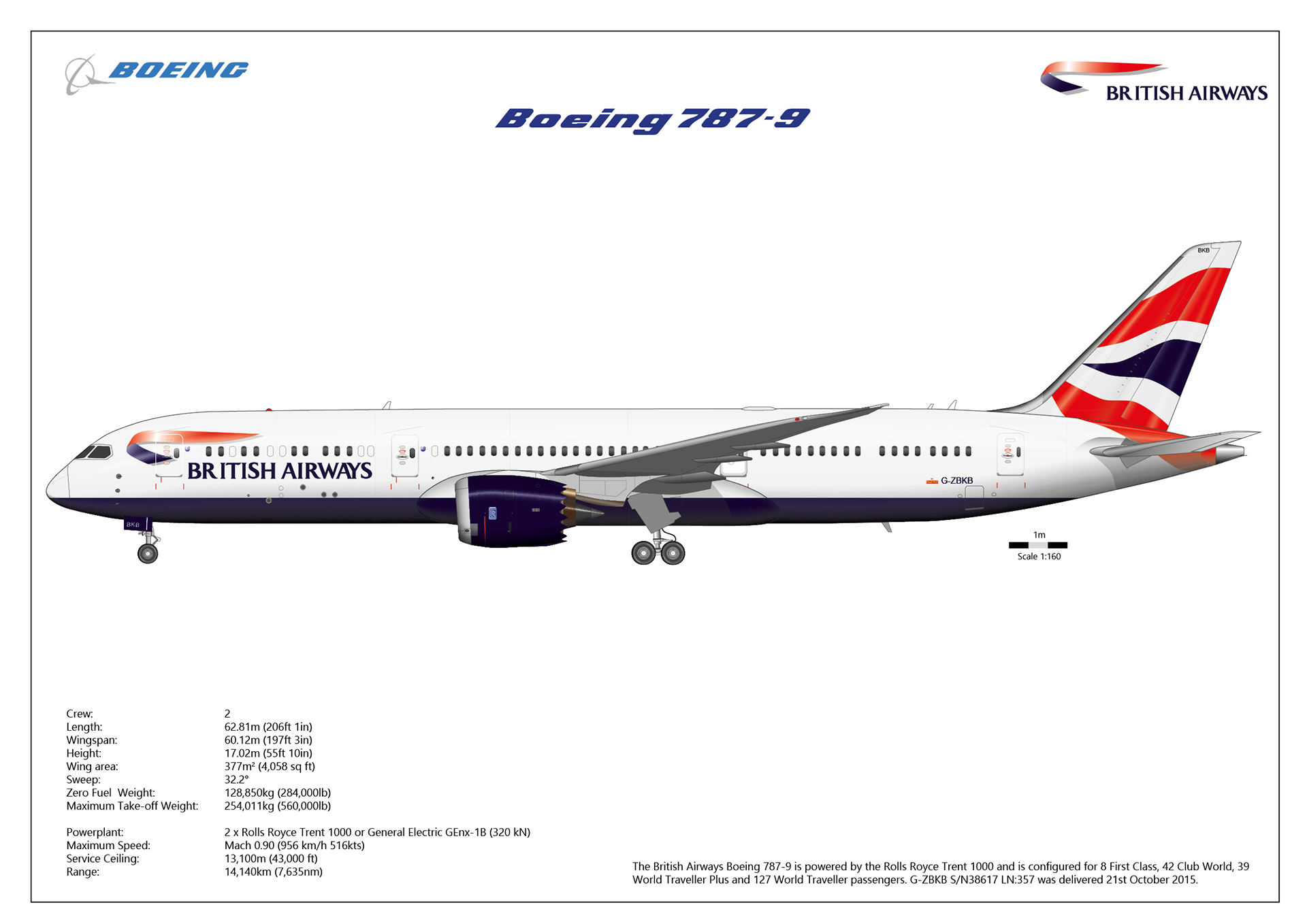 The British Airways Boeing 787-9 is powered by the Rolls Royce Trent 1000 and is configured for 8 First Class, 42 Club World, 39 World Traveller Plus and 127 World Traveller passengers. G-ZBKB S/N38617 LN:357 was delivered 21st October 2015.