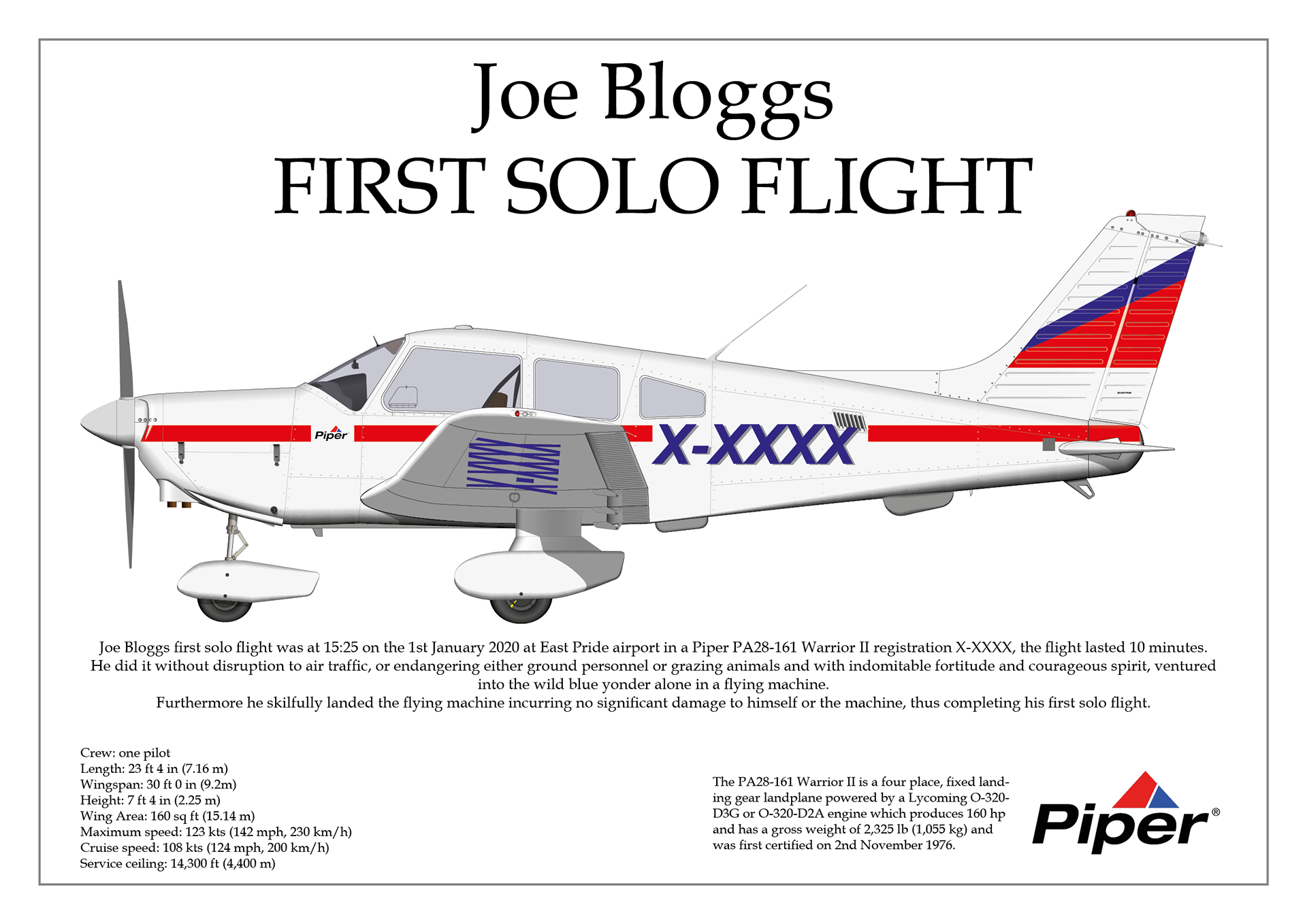 This is a certificate that can be customised to commemorate the first solo flight of a pilot. Although it shows a Piper PA28 Warrior II, it can be changed for any light aircraft and I dress it in the livery of the aircraft that the solo was taken in. The poster is then provided printed in A3 & A4 sizes. for more details visit https://www.cockpitrevolution.com/solo.html