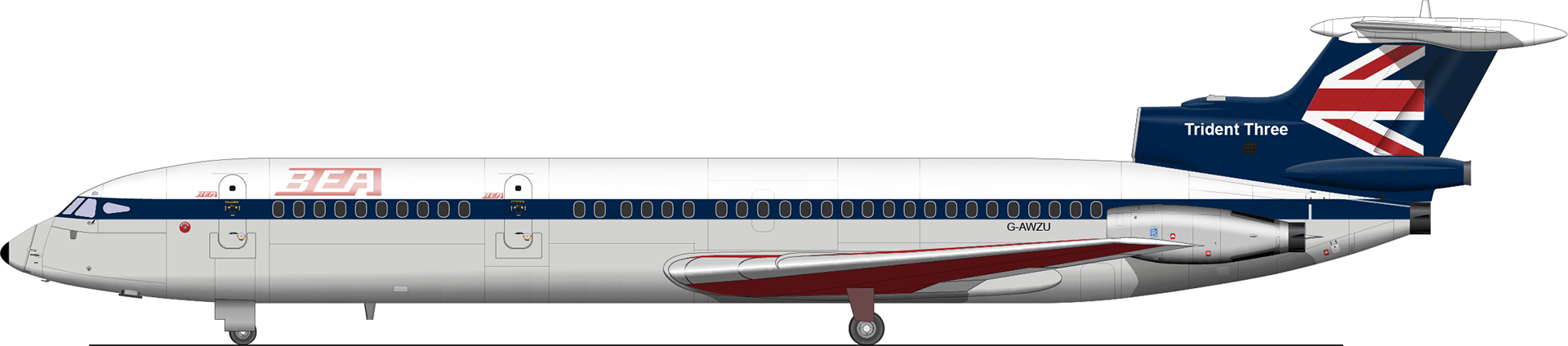 Hawker Siddeley Trident 3 G-AWZU in the colours of British European Airways (BEA) the forerunner of British Airways. BEA/BA operated Tridents from 1964 until 1986. The Trident was the first airliner capable of blind landing.