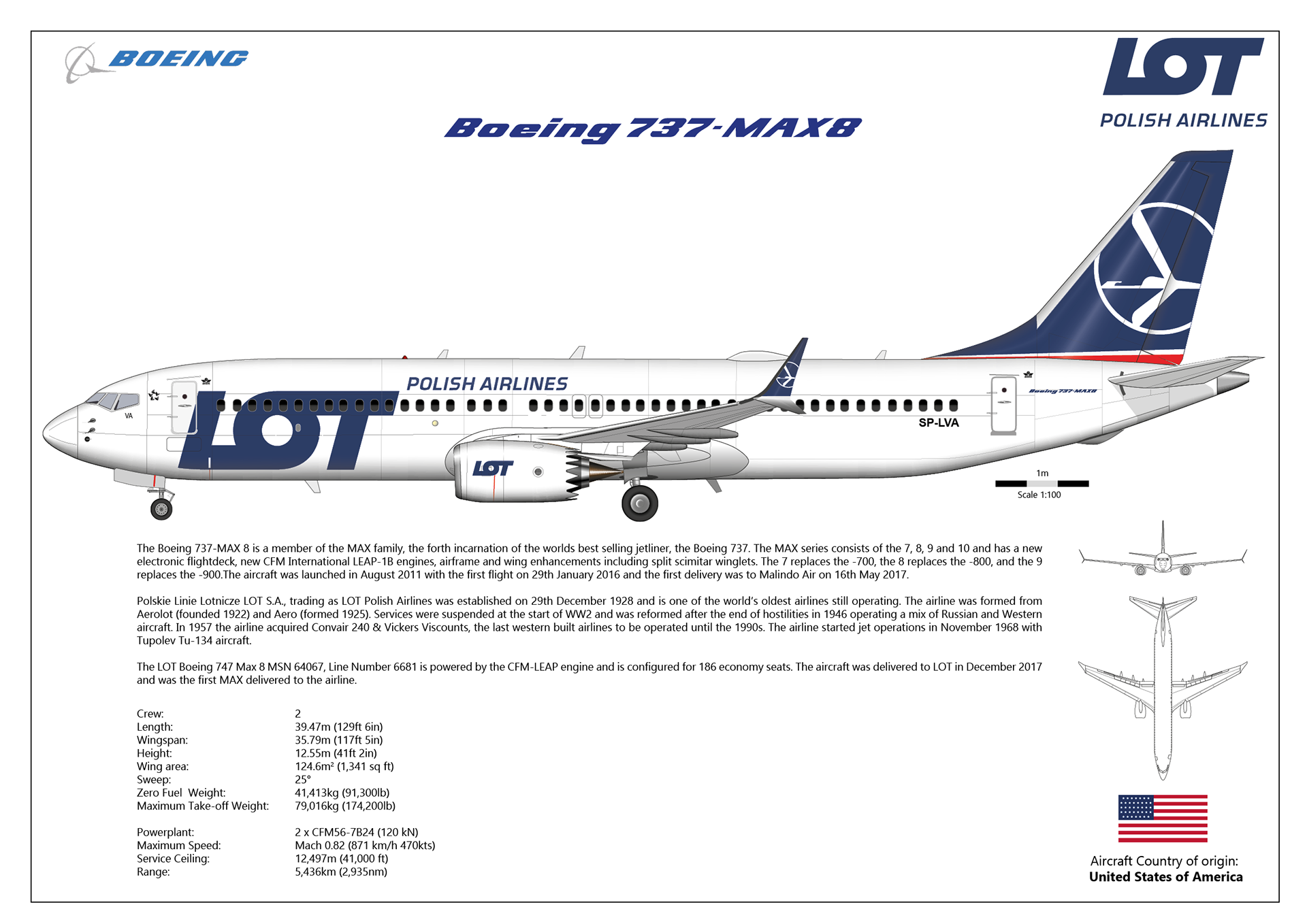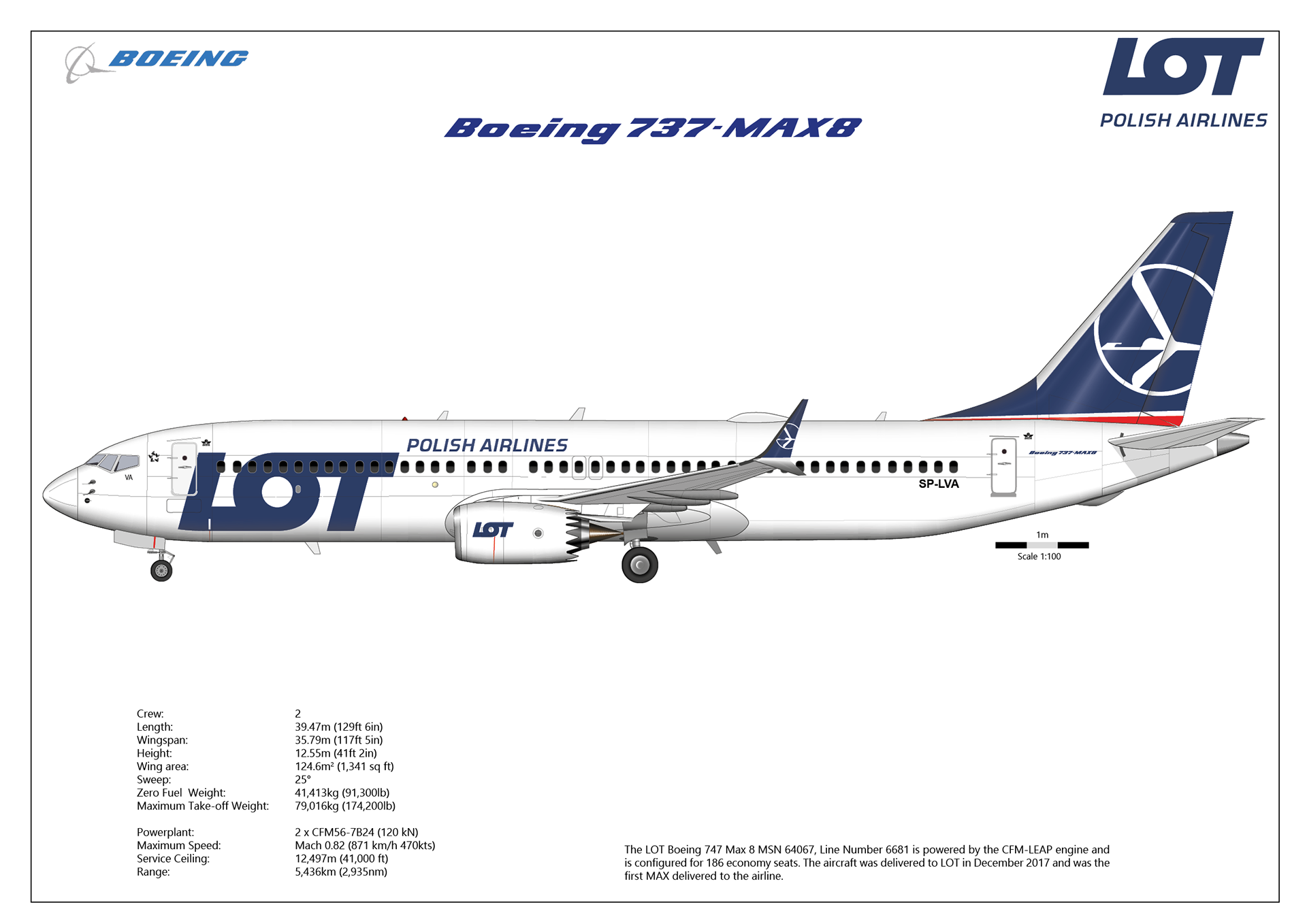The LOT Boeing 747 Max 8 MSN 64067, Line Number 6681 is powered by the CFM-LEAP engine and is configured for 186 economy seats. The aircraft was delivered to LOT in December 2017 and was the first MAX delivered to the airline.